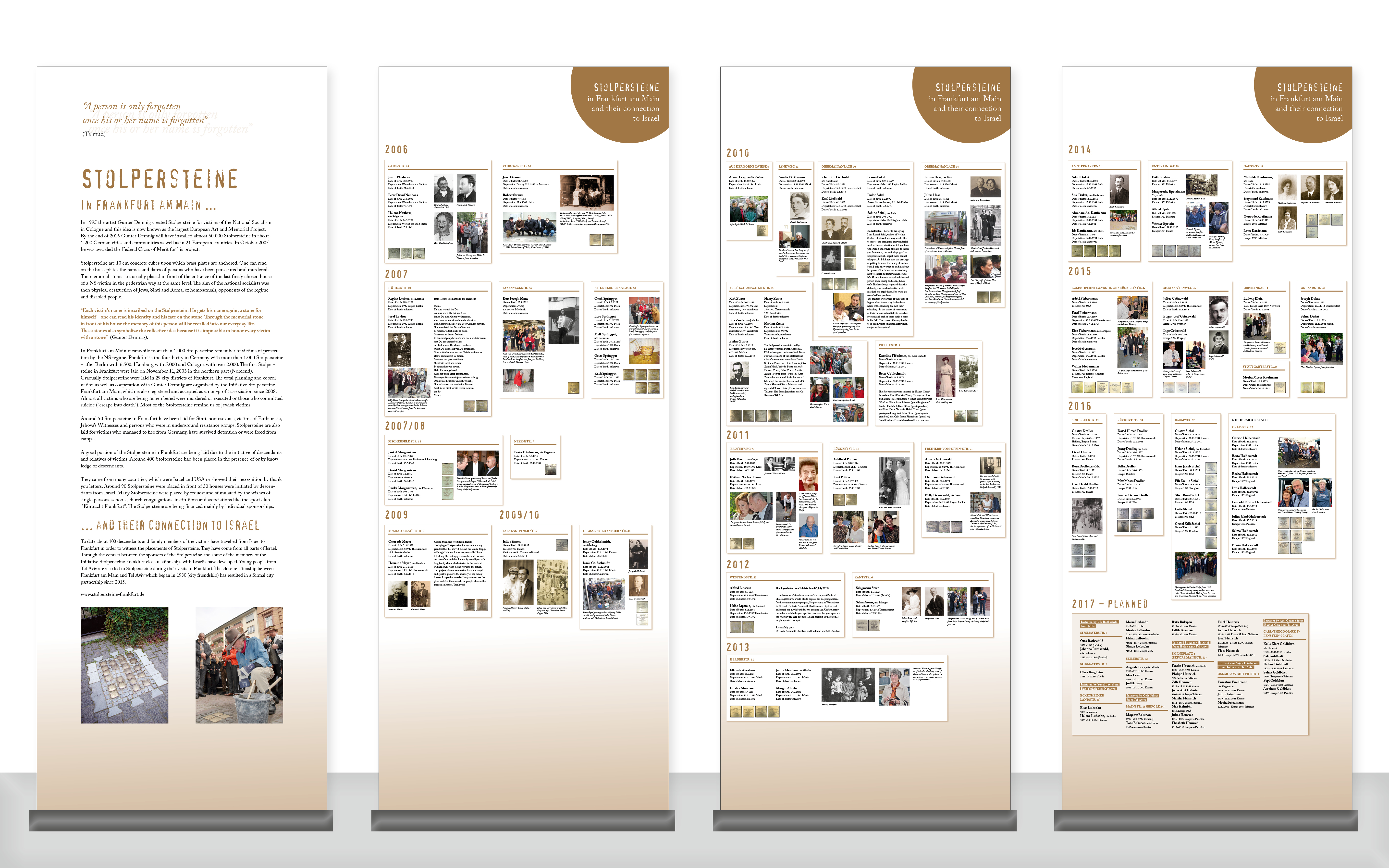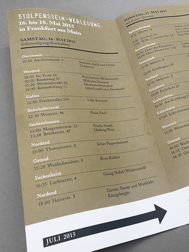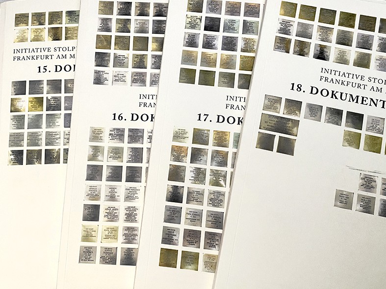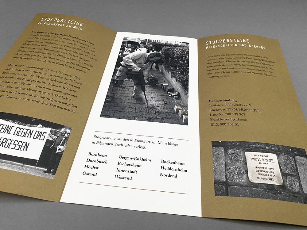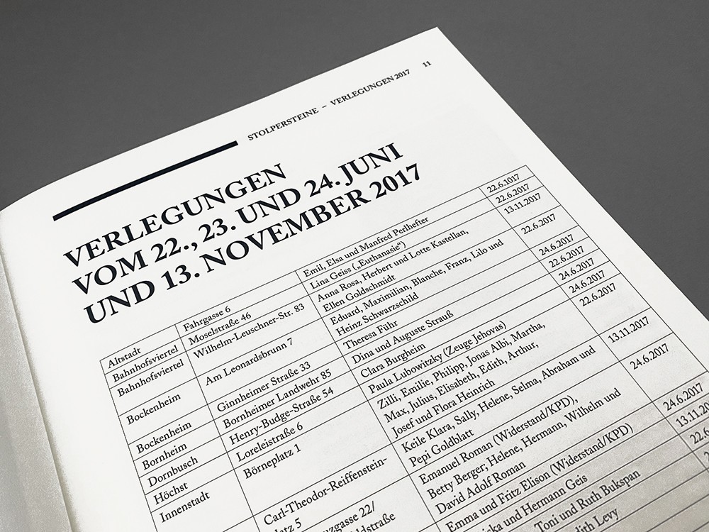 Satz der bis 2021 jährlich erscheinenden Dokumentation mit den Einzelschicksalen der Personen, für die ein Stolperstein verlegt wurde. Gestaltung und Satz der Urkunden, diverser Flyer und der Website.