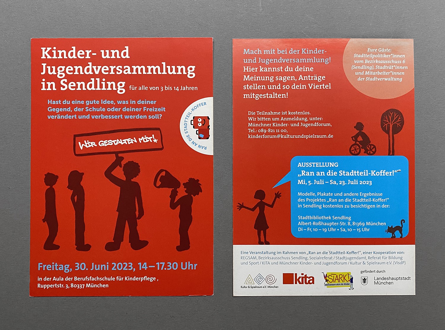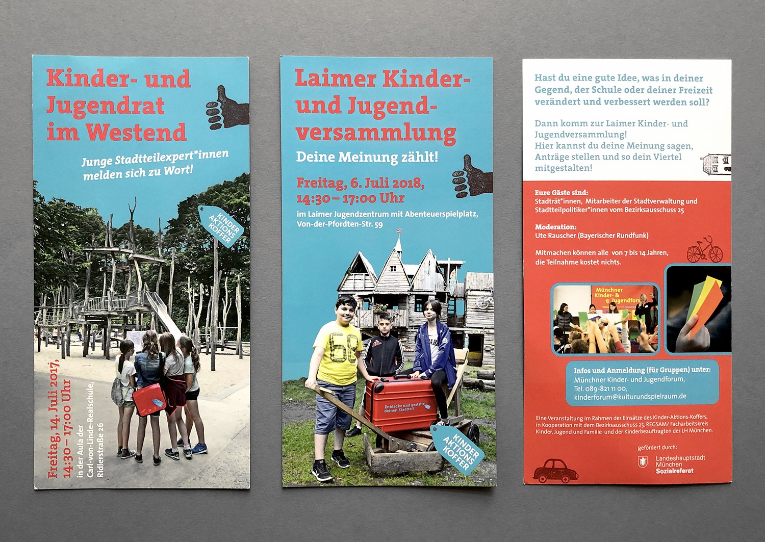 Auf der Basis eines bestehenden Corporate Designs habe ich diverse Flyer und Plakate für das Projekt der "Kinder-Aktions-Koffer" gestaltet, das Münchener Kinder dazu auffordert eigene Vorschläge zur Verbesserung ihres Wohnviertels zu erarbeiten.
