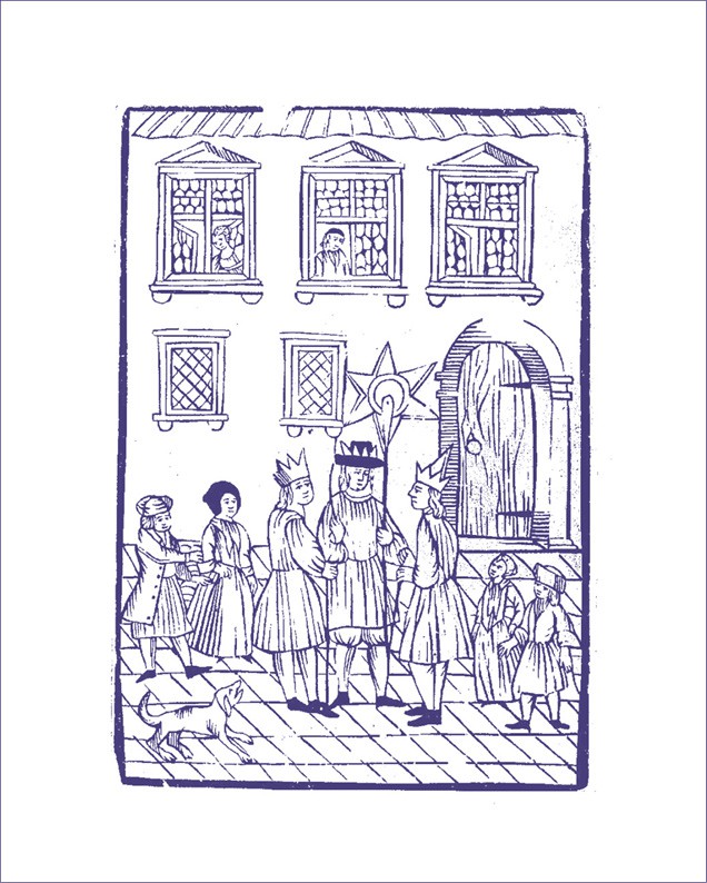Bild 2: Die Sternsinger, Nürnberger Holzschnitt aus dem 17. Jahrhundert, Original im Germanischen Nationalmuseum, gemeinfrei