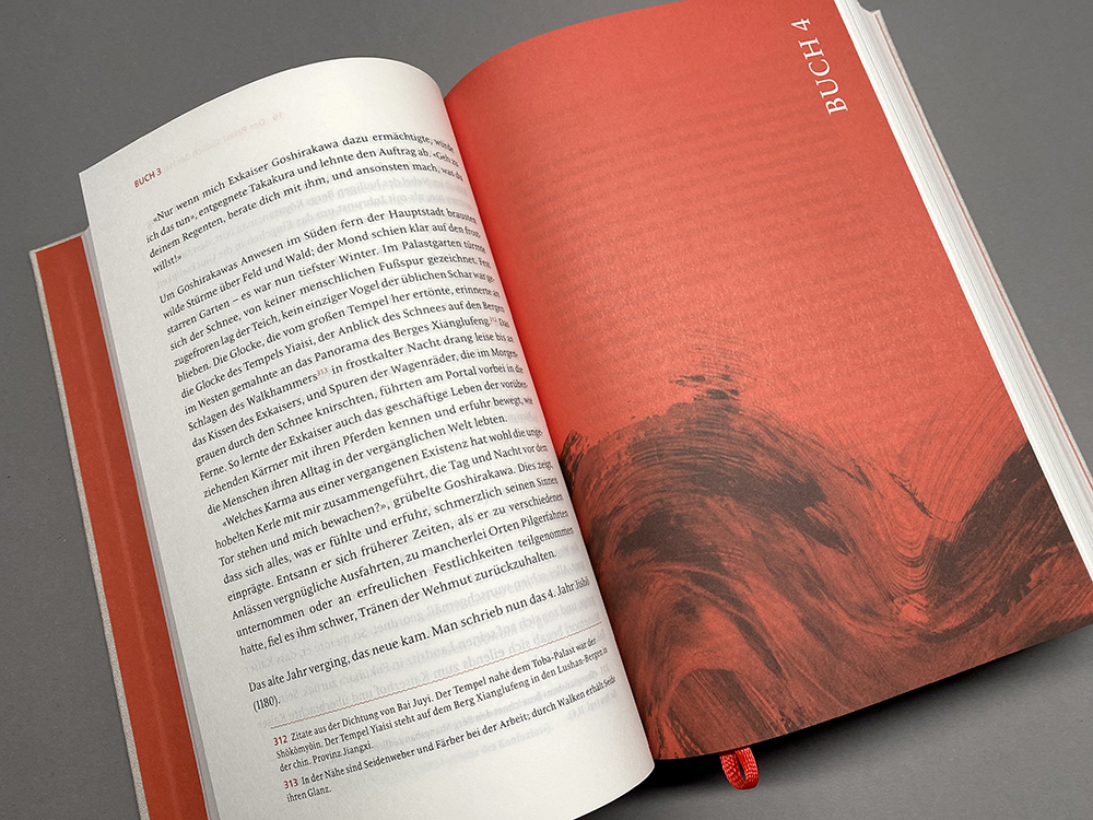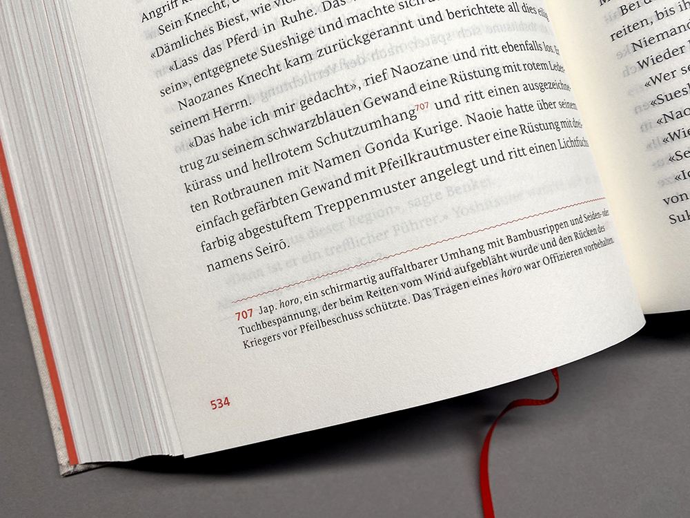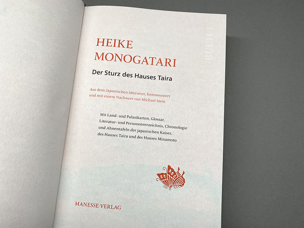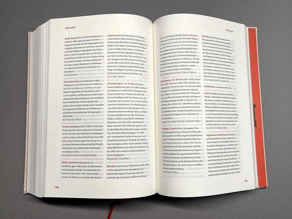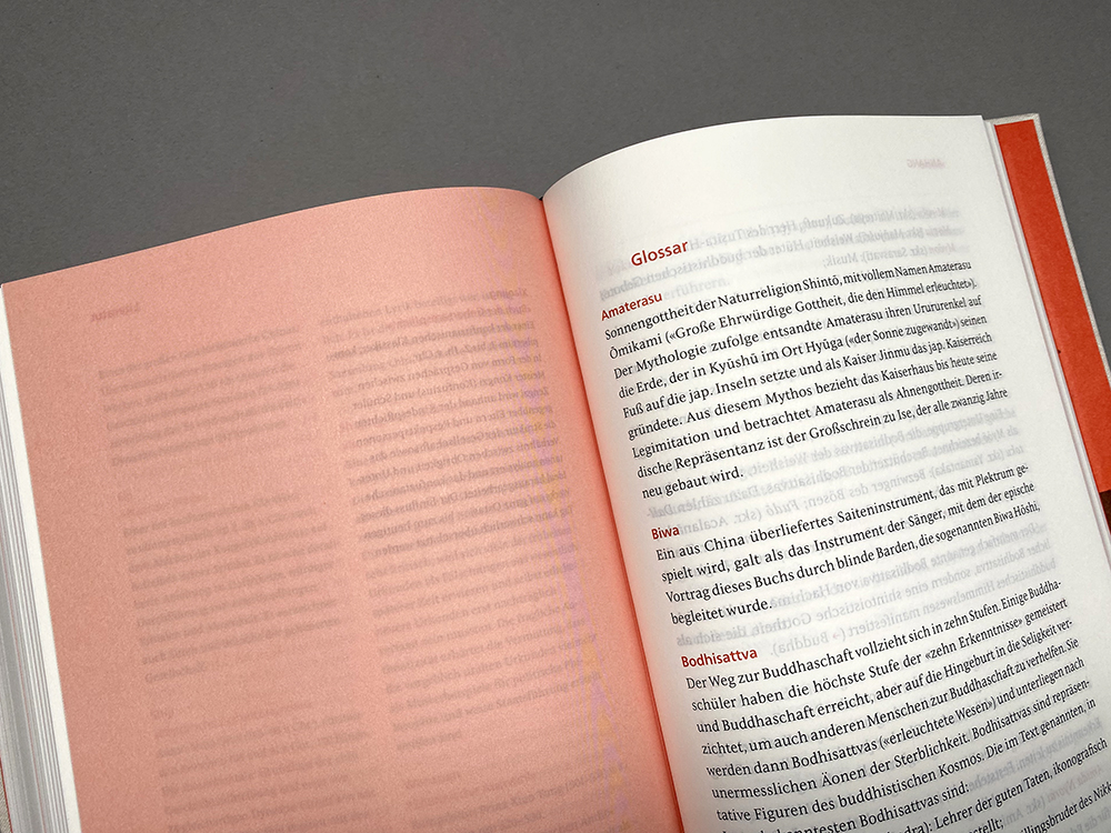 Typografie- und Gestaltungskonzept für die Neuübersetzung des mittelalterlichen japanischen Epos, als Prachtausgabe mit verschiedenen Anhängen und umfangreichen Fußnoten.
