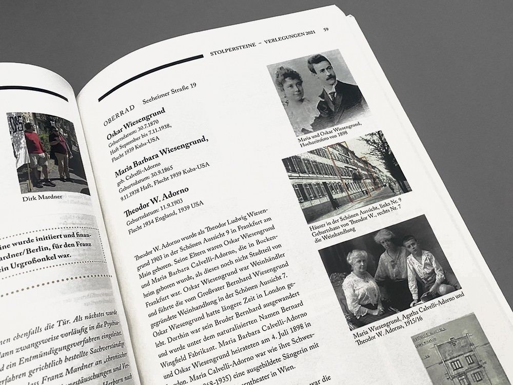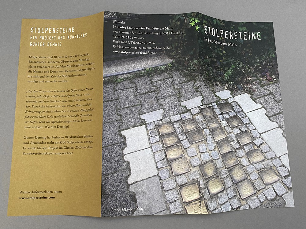 Satz der bis 2021 jährlich erscheinenden Dokumentation mit den Einzelschicksalen der Personen, für die ein Stolperstein verlegt wurde. Gestaltung und Satz der Urkunden, diverser Flyer und der Website.