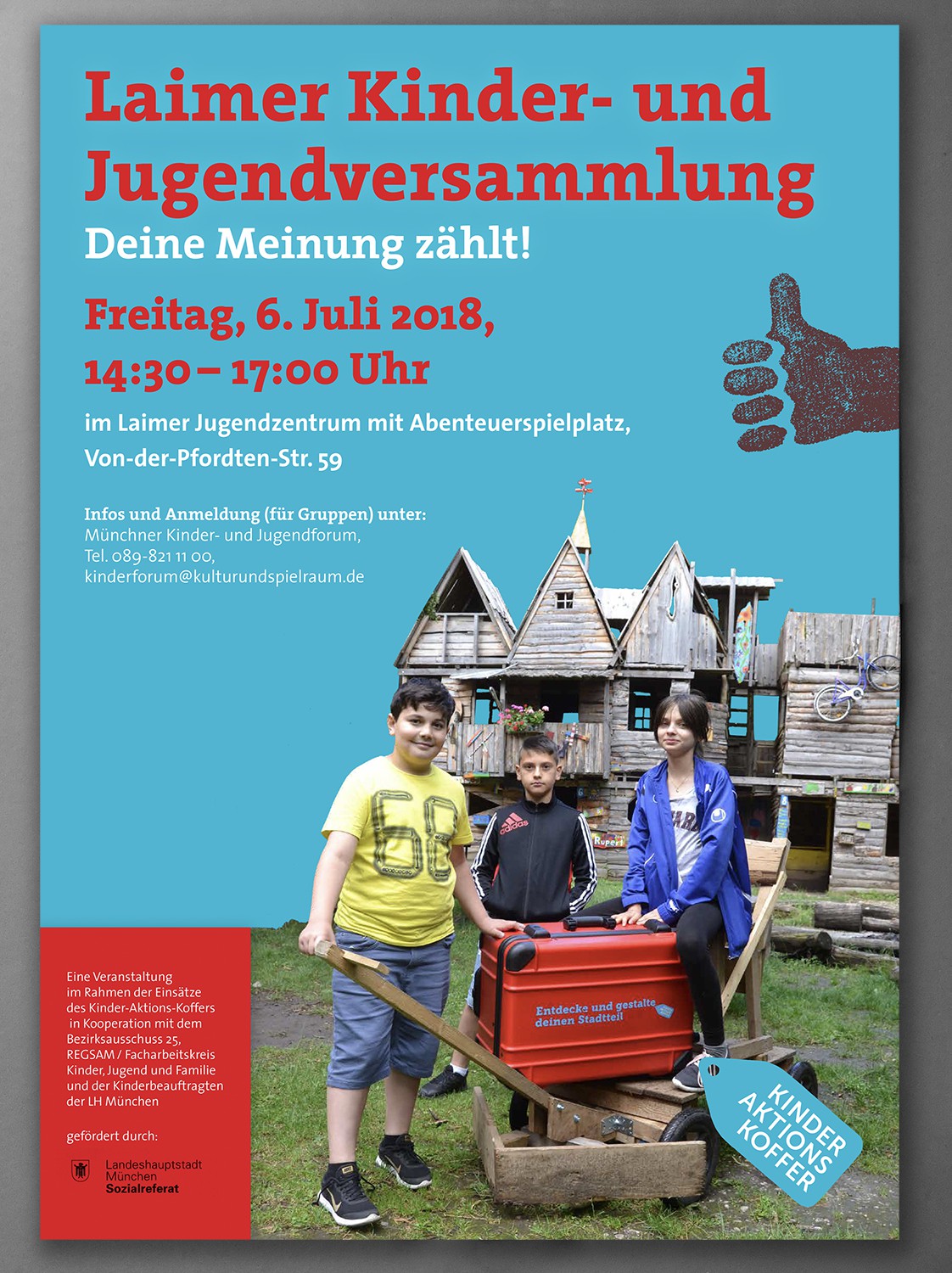Auf der Basis eines bestehenden Corporate Designs habe ich diverse Flyer und Plakate für das Projekt der "Kinder-Aktions-Koffer" gestaltet, das Münchener Kinder dazu auffordert eigene Vorschläge zur Verbesserung ihres Wohnviertels zu erarbeiten.